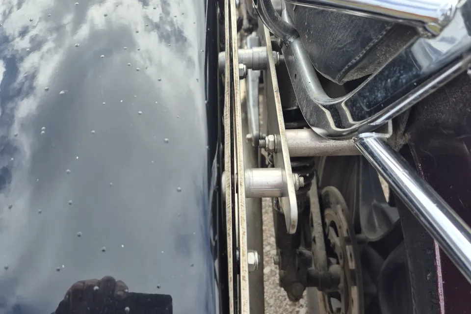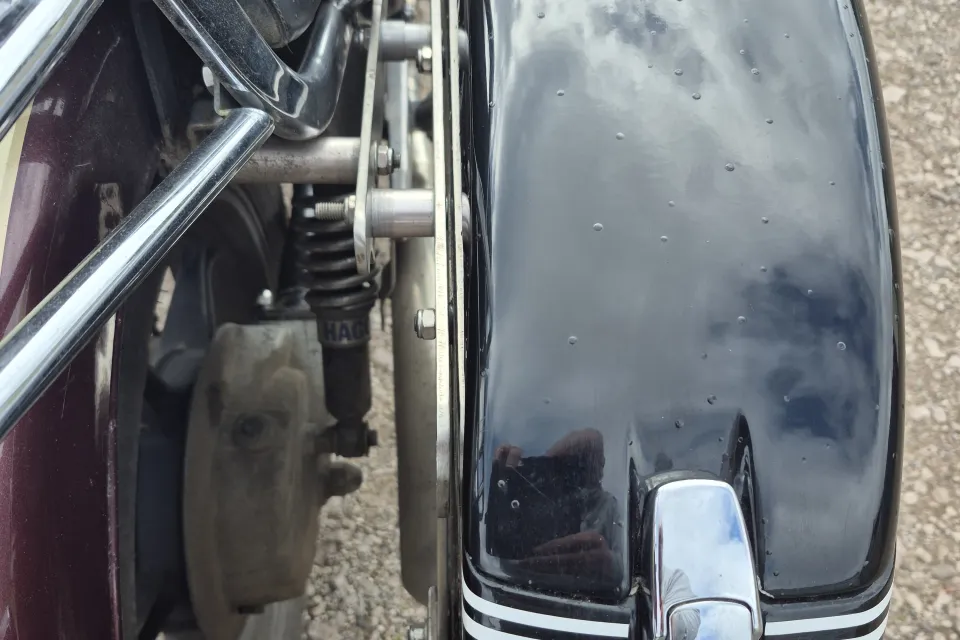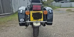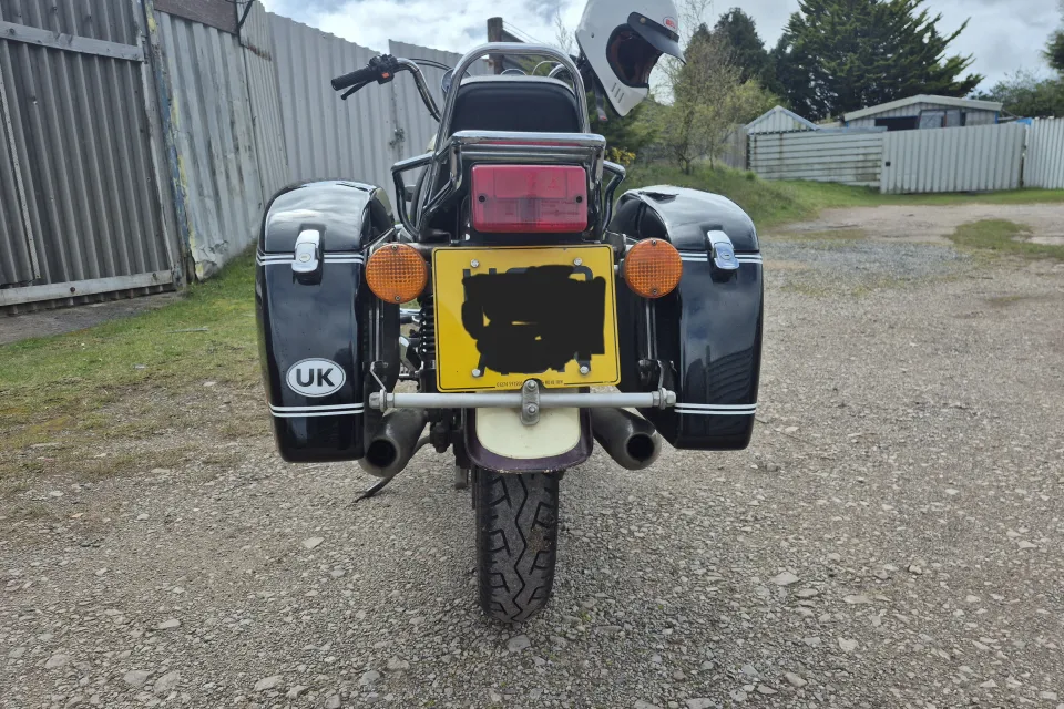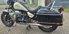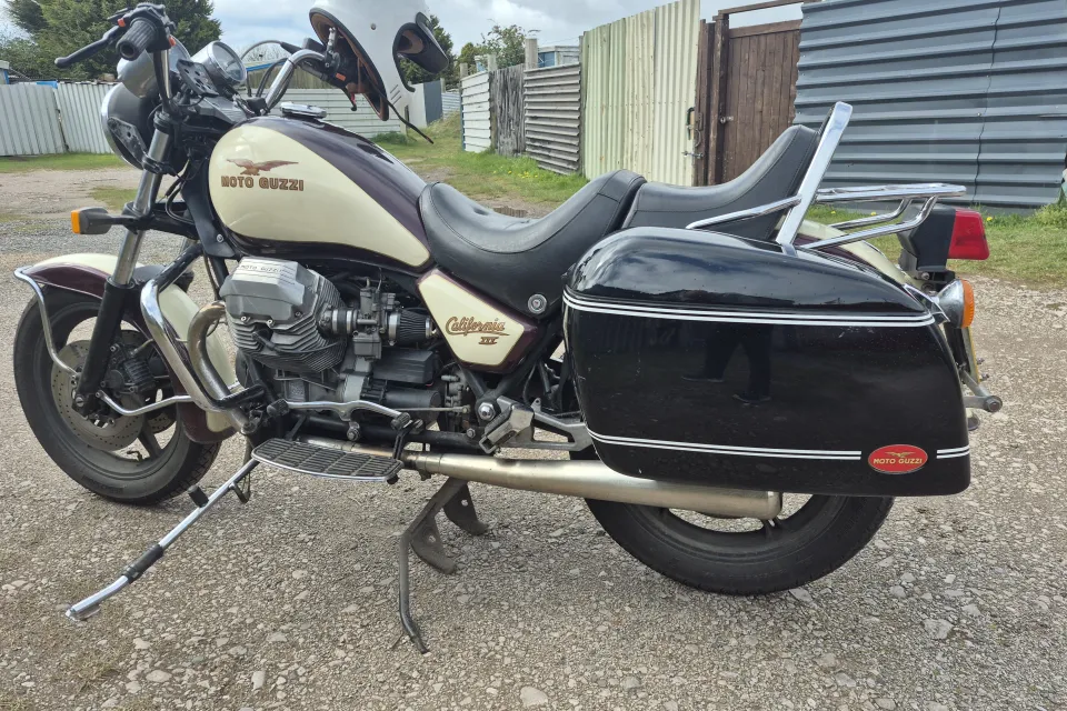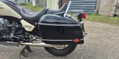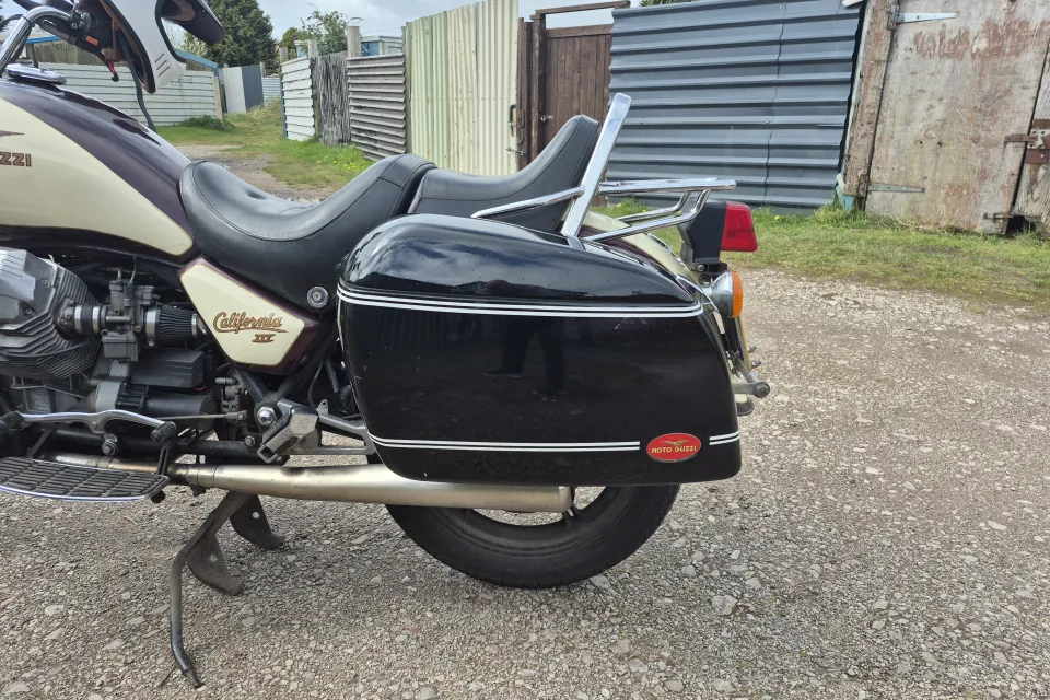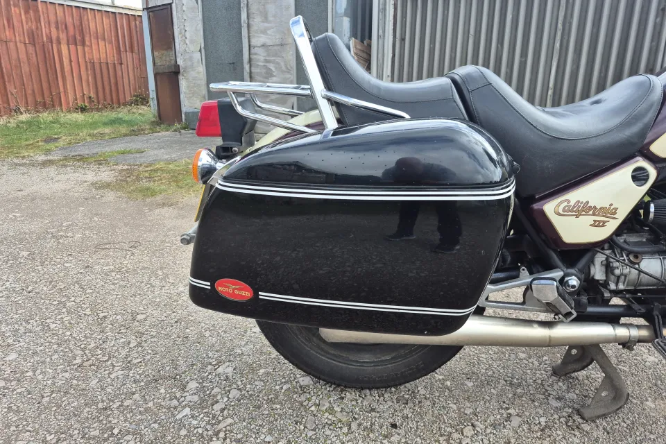 California Vintage panniers with brackets and attachments to fit tonti framed Cali III. brackets are made from Stainless Steel, plus bosses and spaces turned up by myself. Strong set up, as used on several tours. Panniers boxes have slight bumbling in black paint, comes with key, but one lock has old key stuck inside, but still locks. Can post to UK at buyers cost.