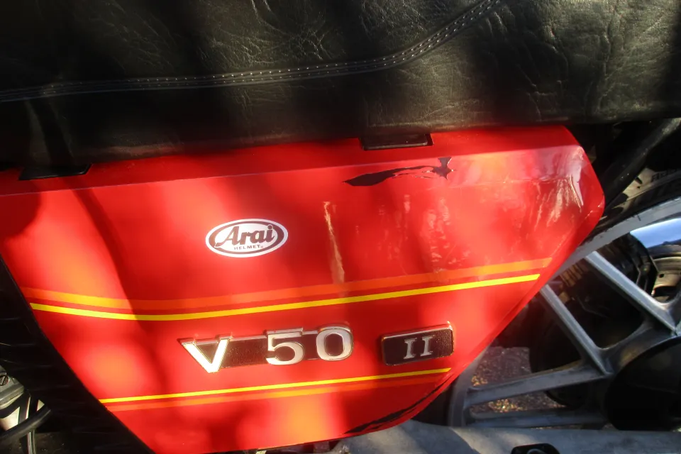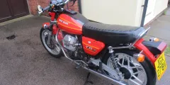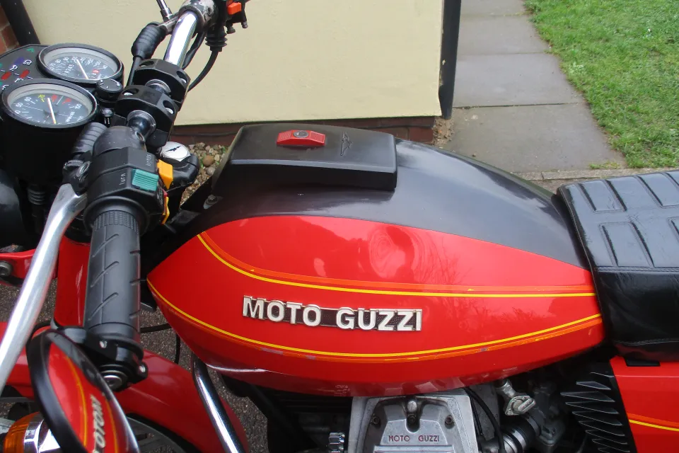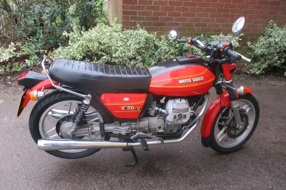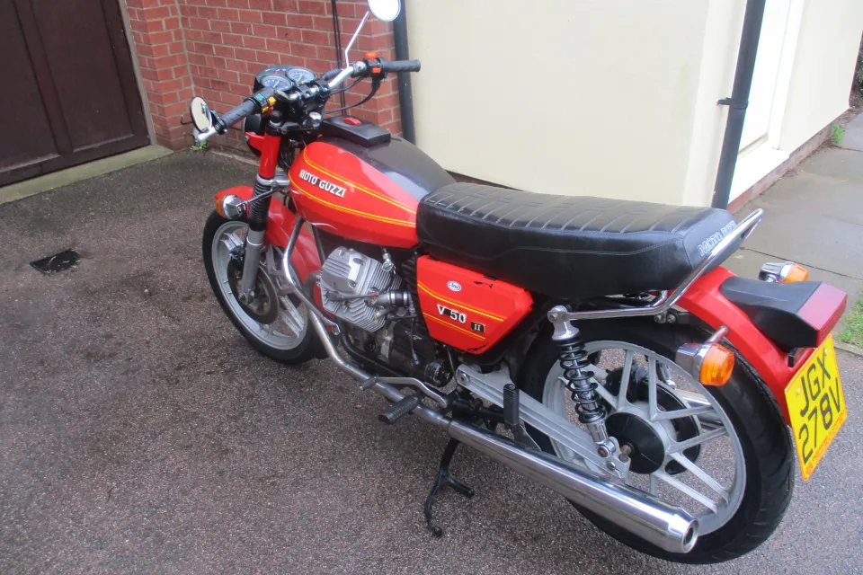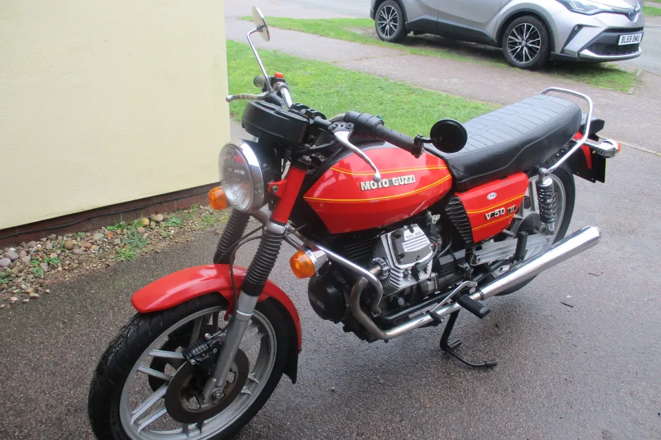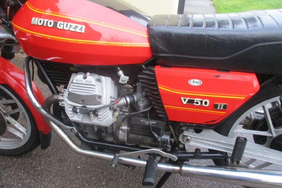 I am selling my 1980 Moto Guzzi V50 11. The bike is in original unrestored condition.whivh is quite good concidering it is 45 years old.It is not perfect, there is some light rust on the frame rails, and exhaust headers, a small very shallow dent top left of petrol tank & the right hand side cover paint is cracked on a couple of places.The bike does start and run, but could do with the carbs being set up correctally or cleaned.The bike does benefit from a new Battery last year,New rear shocks, nearly new front and rear tyres, rebuilt front calipers, with new seals and Teflon pistions. The bike has braided front brake lines, and still retains the linked braking system, all the lights and switches work, the R/H switches have been replaced with non moto Guzzi switch at some piont, also the Original Bosch electronic Ignition has been replaced with Silent Hektik system at some point in the past.