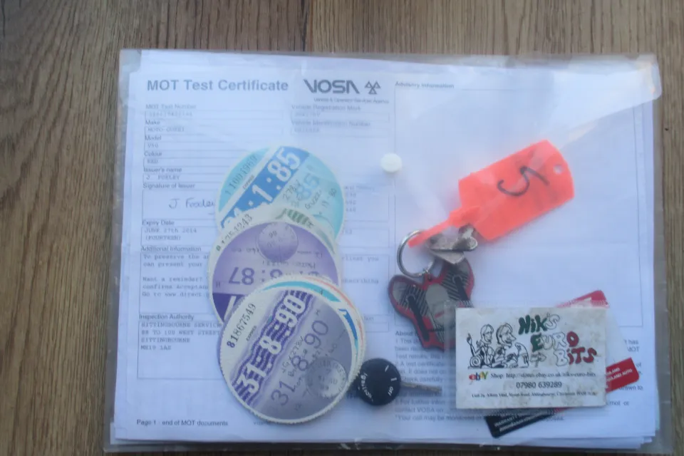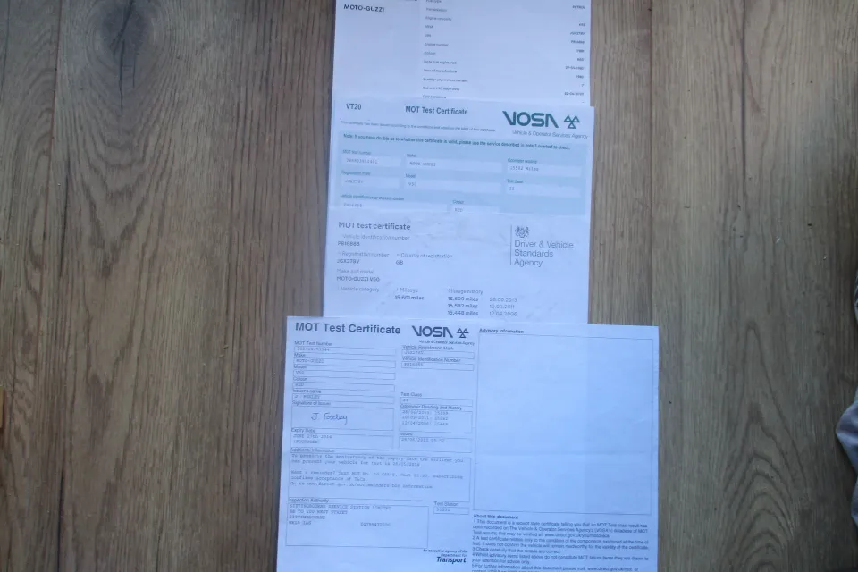 I have the V5 in my name, the bike showing 8 previous owners. A large folder with receipts of parts fitted, some old M.O.T. certificates and old tax discs. 2 keys.