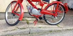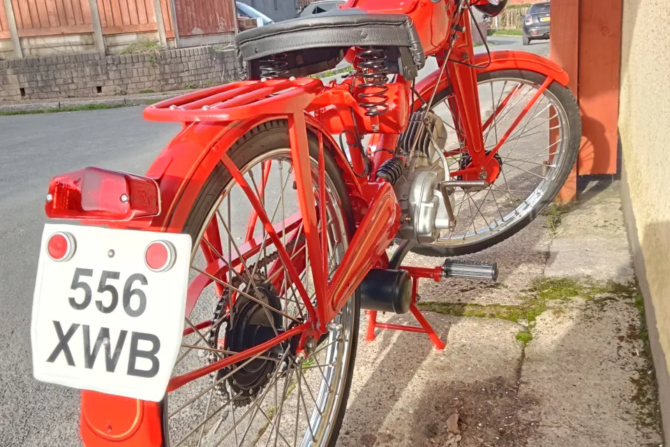 The bike has a 65cc single cyliner two-stroke engine with a hand change three speed gearbox.