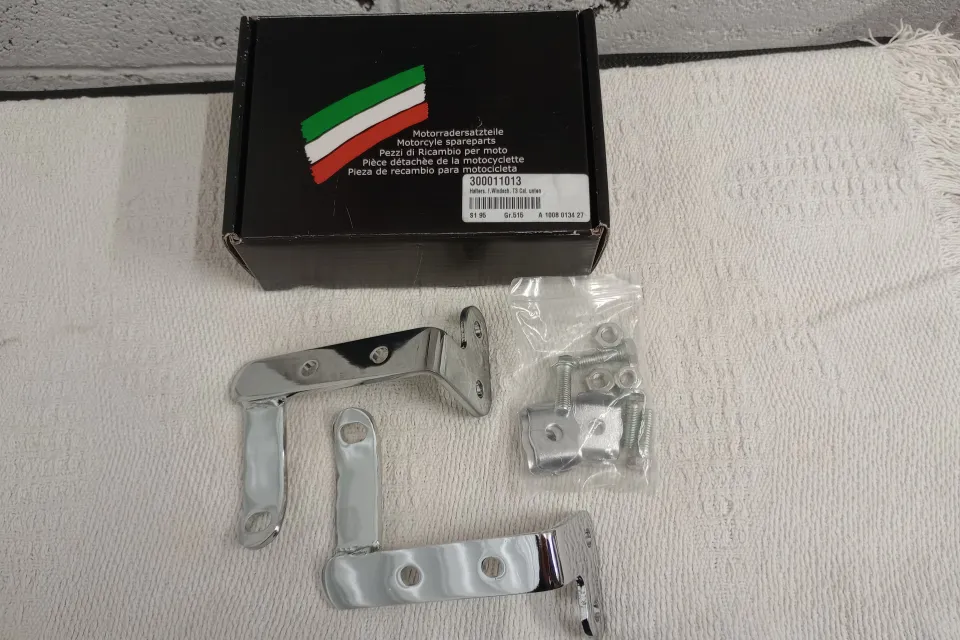 Moto Guzzi T3 California & G5 lower screen support kit. Unused and originally supplied by Stein Dinse, though now no longer available. Complete with clamps and bolts.