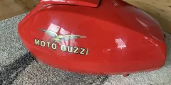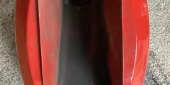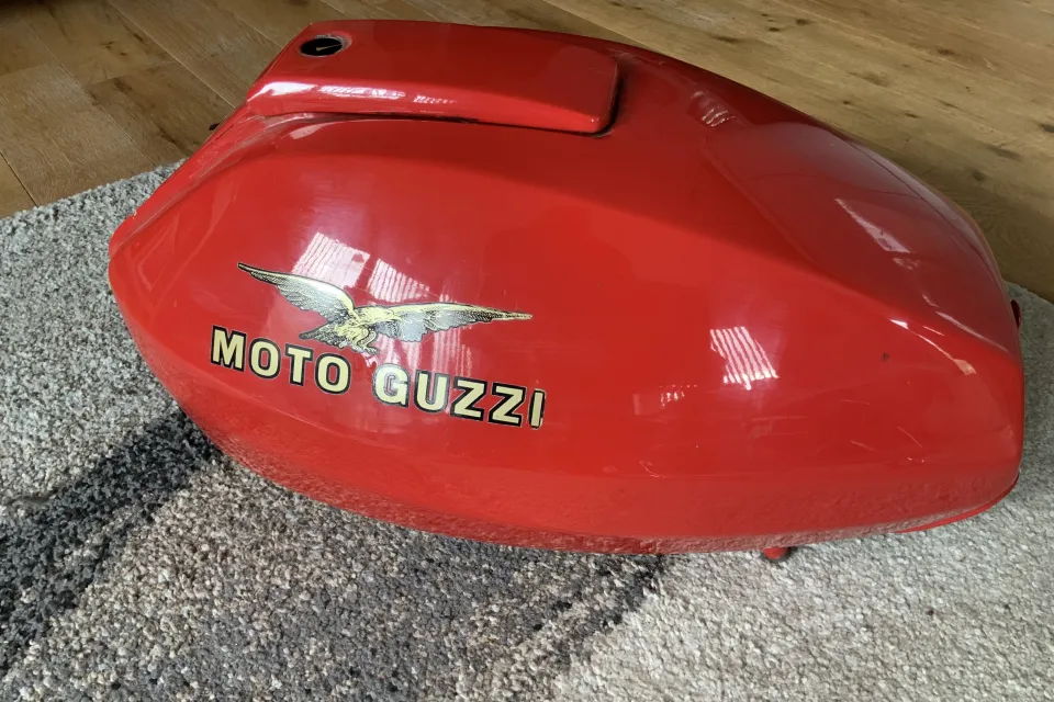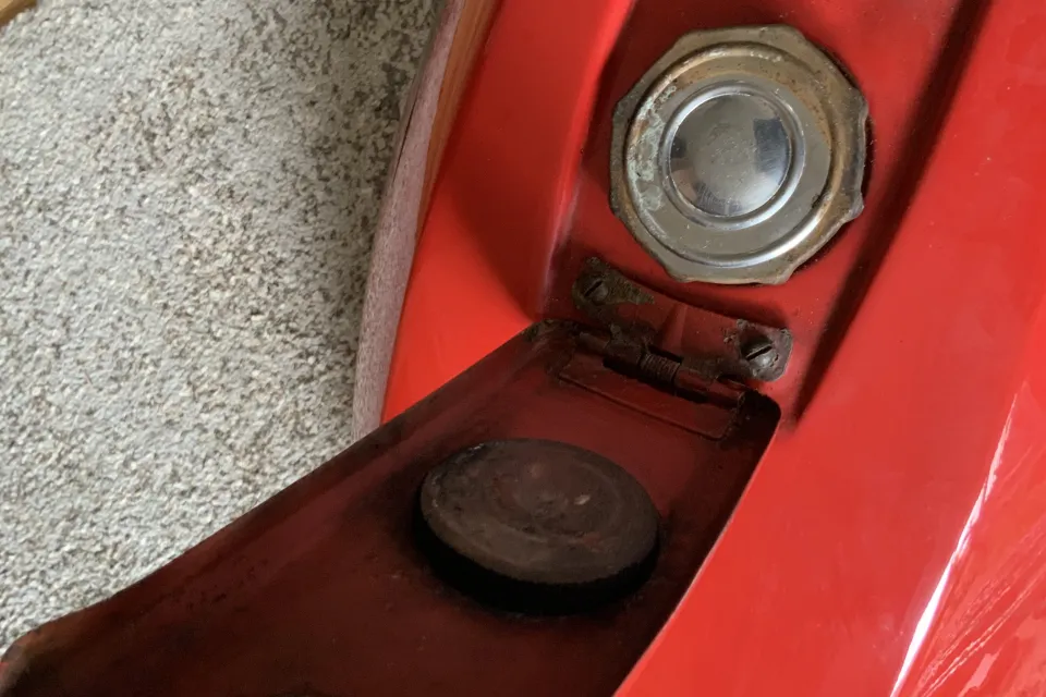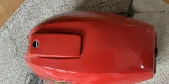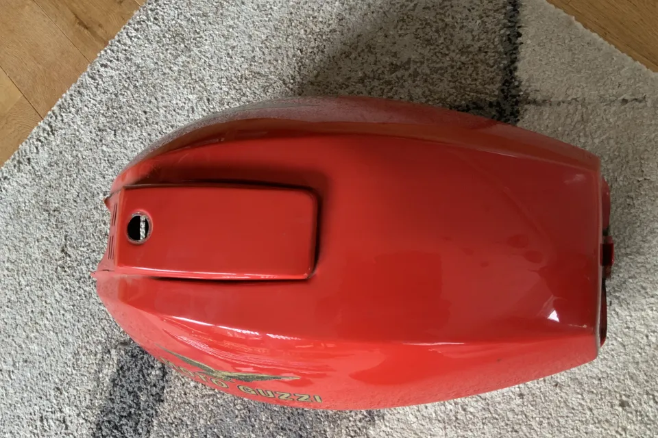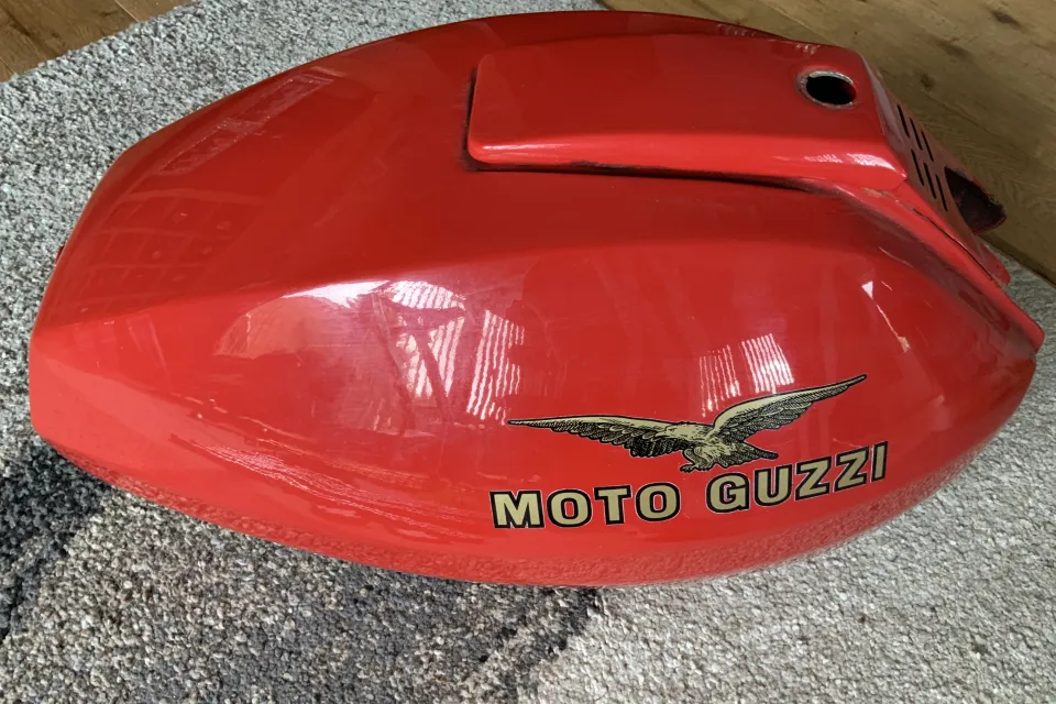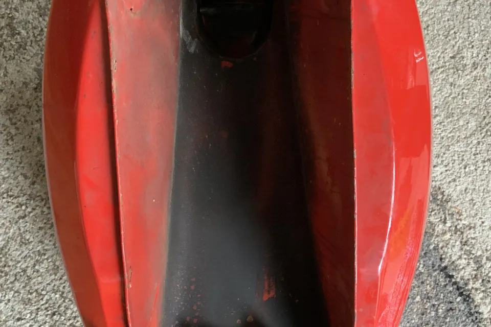 No petcocks. Paintwork good, very minor pitting as you'd expect for a 50 year old tank. No filler lock or key. No sign of penetrations. Internals will need a rattle with grit to polish up before filling.
