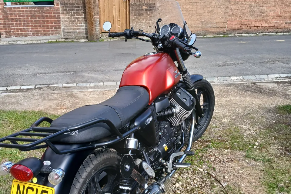 Fitted with a screen and luggage rack, and bar end mirrors so set up for touring.