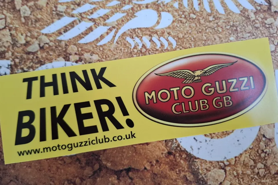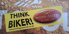 NEW AUTUMN 2025 - THINK BIKER! sticker with the Moto Guzzi logo alongside. It's a reverse-applied adhesive sticker, which is ideal for the back window of your car, motorhome etc.